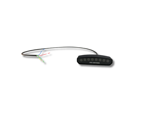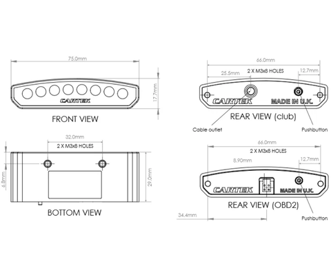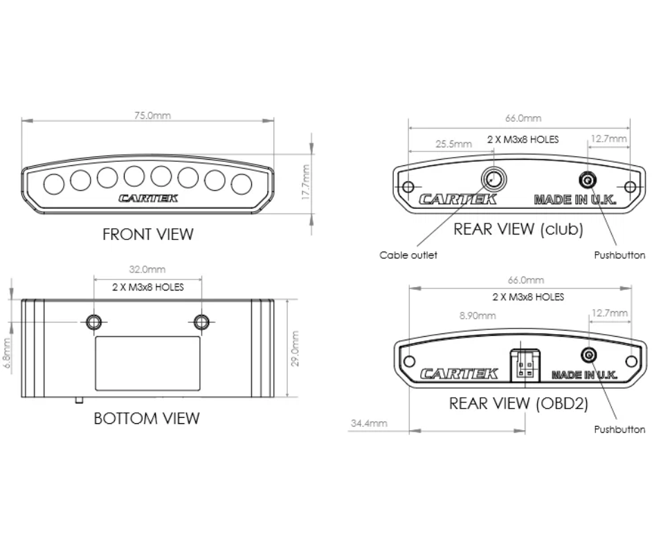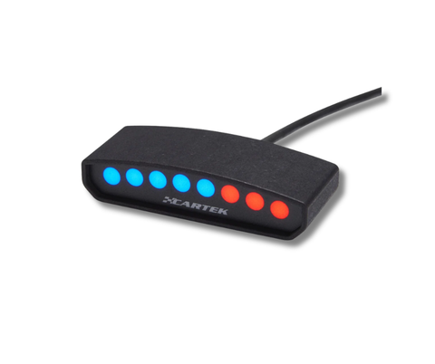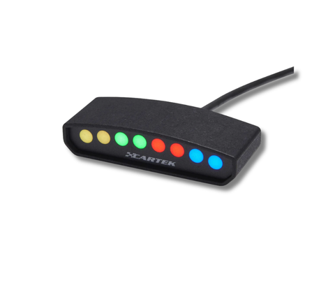 The SHIFT-LIGHT (Club) from CARTEK is a dashboard mounted device that is designed to indicate to the driver the optimum time to shift up a gear to obtain maximum performance from their engine. The device contains 8 multi-coloured LEDs which form a display sequence that will commence at an engine speed prior to optimum and complete at precisely the optimum speed thereby giving the driver early indication to shift up before the rev limiter is reached or engine damage occurs. The SHIFT-LIGHT (Club) requires an engine speed signal to operate which can be any RPM output from an ECU (5V or 12V square wave), tachometer signal or ignition coil signal. Not suitable for engines with older CDI Ignition systems.