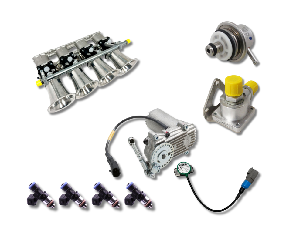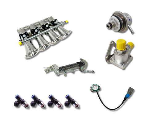 This super light weight Motorsport kit is fully port matched and port aligned with the Duratec 2L HE port angle of 20 Degrees. It is commonly used in Formula or Sports Prototype cars where the bonnet does not limit height.  Standard Ford fuel injectors will not fit.  See recommended injectors in options.
