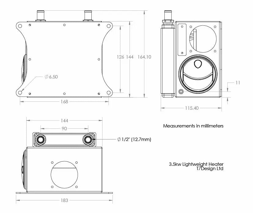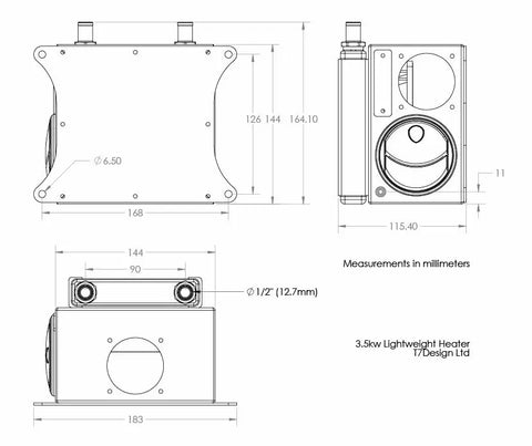 The dimensioned drawing shown below is for our standard 3.5kw Lightweight Heater but shares the same overall dimensions as the side vents version.