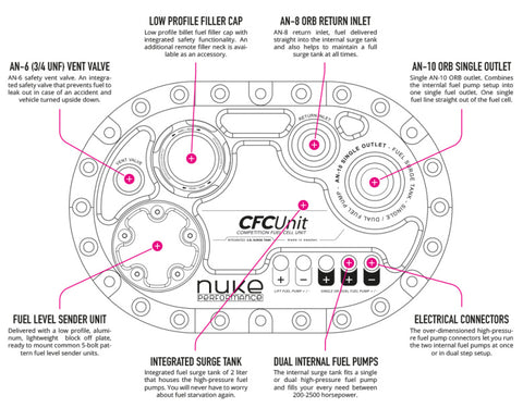 The Nuke Performance CFC Unit, specially developed for ATL and Fuel Safe fuel cells, with integrated fuel surge tank and fuel pump hanger. Fits the most common fuel cells for your every need.