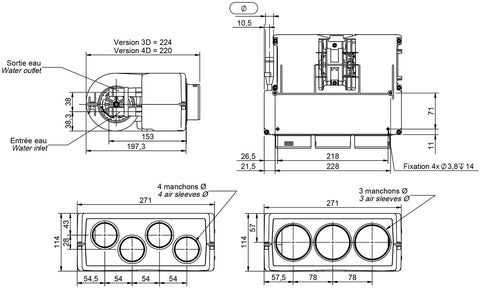 This heater is also available with a number of different options; 3 or 4 outlets in a number of different diameter outlet panels, 12 motor, and an optional air ducting connector that allows for fresh air to be ducted into one side of the fan.