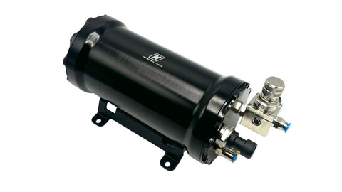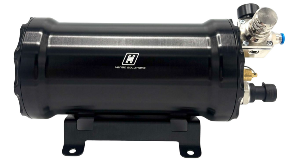 The pressure vessel is CNC machined from billet aluminium, containing a middle body and two end caps. It is fitted with a pressure regulator to maintain a constant air supply output and to also increase the efficiency of the compressor loads. A 0-5v output pressure sensor is also fitted