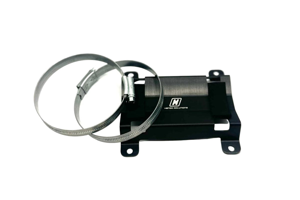 The pressure vessel mounting kit is a folded aluminium sheet metal part with a black anodised coating, it has 4x Ø6.5 holes for mounting to the chassis.