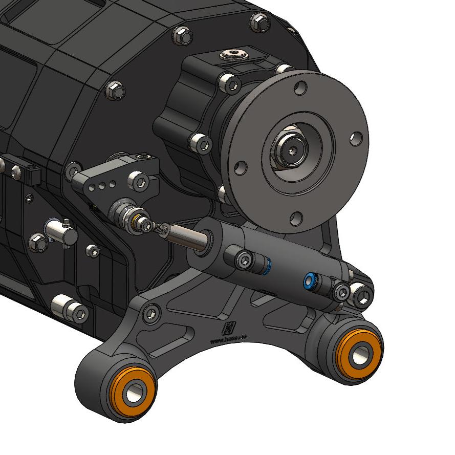 Kit consists of Main Gearbox bracket with paddleshift actuator mount designed into it and Barrel Ratchet Hub, mounted to chassis using two anti-vibration bushings.